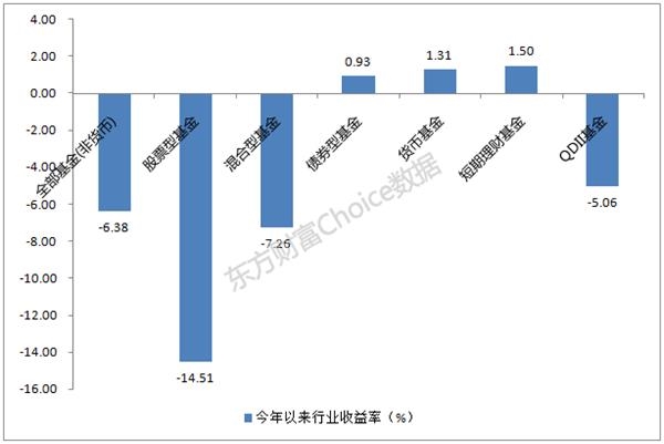 受市场动荡影响,今年上半年非货币基金总体收益-6.38%。上半年只有债券型基金、货币基金和短期理财基金收益为正,分别是0.93%,1.31%和1.50%。