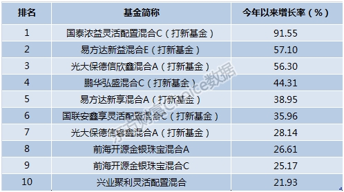 截至6月30日,在2016年上半年基金业回报率前二十排行榜中,八支打新基金和一支qdii基金占据了榜单前九名,占据榜单剩余11席的都为混合型基金。